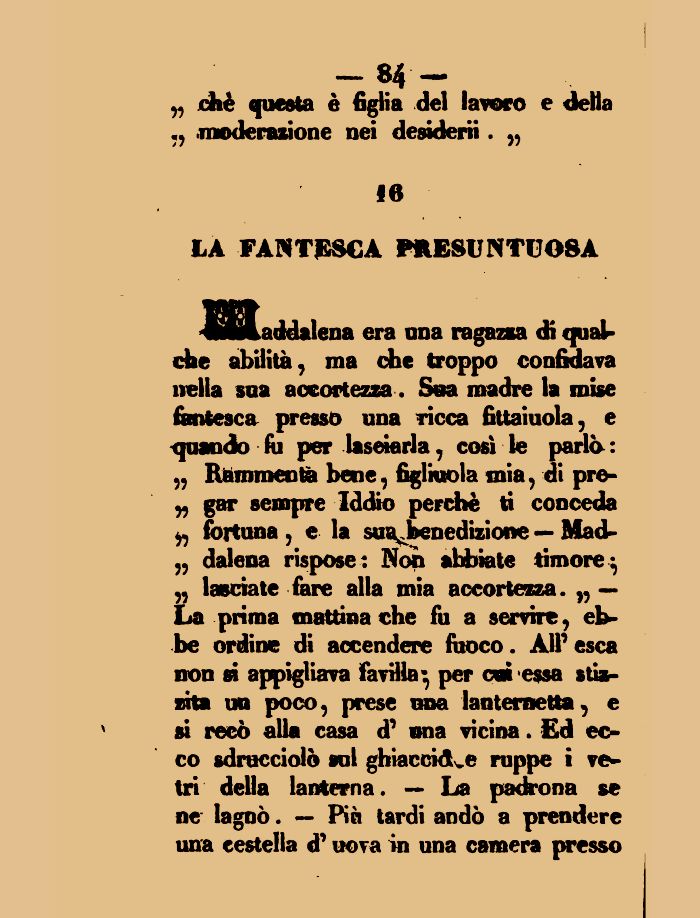 «Maddalena era una ragazza dì qualr die abilita, ma che troppo confidava nella sua accortezza . Ssa madre la mise fantesca presso una ricca fittaiuola, e quando fu per lasciarla, così le parla : „ Rammentò bene, figliuola mia, di pre-„ gar sempre Iddio perchè ti conceda fi fortuna , e la suajwnedizione — fifad-„ dalena rispose : Non abbiate timore^ ,, lasciate fare alla mia accortezza. „ — La prima mattina che fu a servire, ebbe ordine di accendere fuoco. All'esca non si appigliava favilla^ per cui essa stizzita un poco, prese una lanternetta, e si recò alla casa d' ma vicina. Ed ecco sdrucciolò sul ghiaccidve ruppe i vetri della lanterna. — La padrona se ne lagnò. — Piti tardi andò a prendere una cestella d'uova in una camera presso