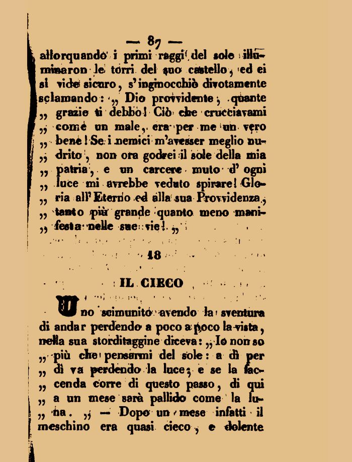 aHorquandó' i primi raggiò del sole illumina ronJé tórri del *uo cartello j ed ei si videi sicuro, s'inginocchiò divotamente sciamando: <„ Dio provvidente, quante „ grazie ti debbo ! Ciò* che crutti&vami „ come un male,* erapermeun v?ro ,, bene ! Se i nemici m'avesser meglio »u«< „ drito!, non ora godrei il sole della mia „ patria , e un carcere muto d' ogni ,, luce mi avrebbe veduto spirare! Glo-„ ria all' Eterno ed élla sua Provvidenza., ,, tanto pià grande quanto meno mani-^feslaneUesaeTÌe!„