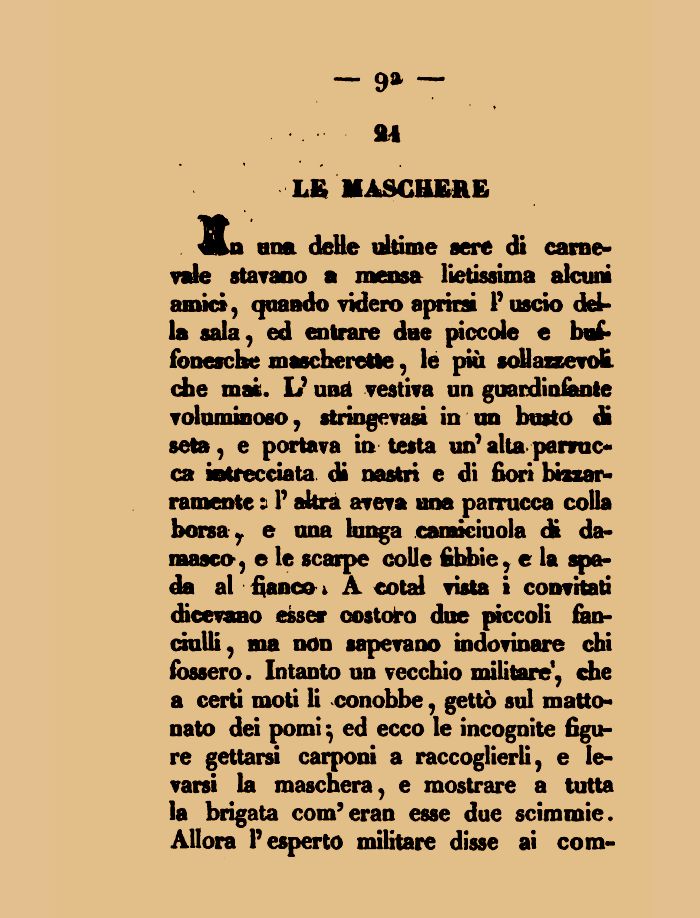 una dette ultime sere di carne-vale stavano a mensa lietissima alcuni amici, quando videro aprirsi P uscio della sala, ed entrare due piccole e buffonesche mascherone, le più sollazzevoli che mai. L? und vestiva un guardinfante voluminoso, stringersi in un busto di seta, e portava in testa un9 alta parrucca intrecciata dì nastri e di fiori bizzarramente s P altra aveva una parrucca colla borsa y e una lunga camiciuola di damasco, e le scarpe colle fibbie, e la spada al fianco t A co tal vista i convitati dicevano esser oostoto due piccoli fanciulli , ma non sapevano indovinare chi fossero. Intanto un vecchio militare*, die a certi moti li conobbe, gettò sul mattonato dei pomi } ed ecco le incognite figure gettarsi carponi a raccoglierli, e levarsi la maschera, e mostrare a tutta la brigata com'eran esse due scimmie. Allora P esperto militare disse ai com-