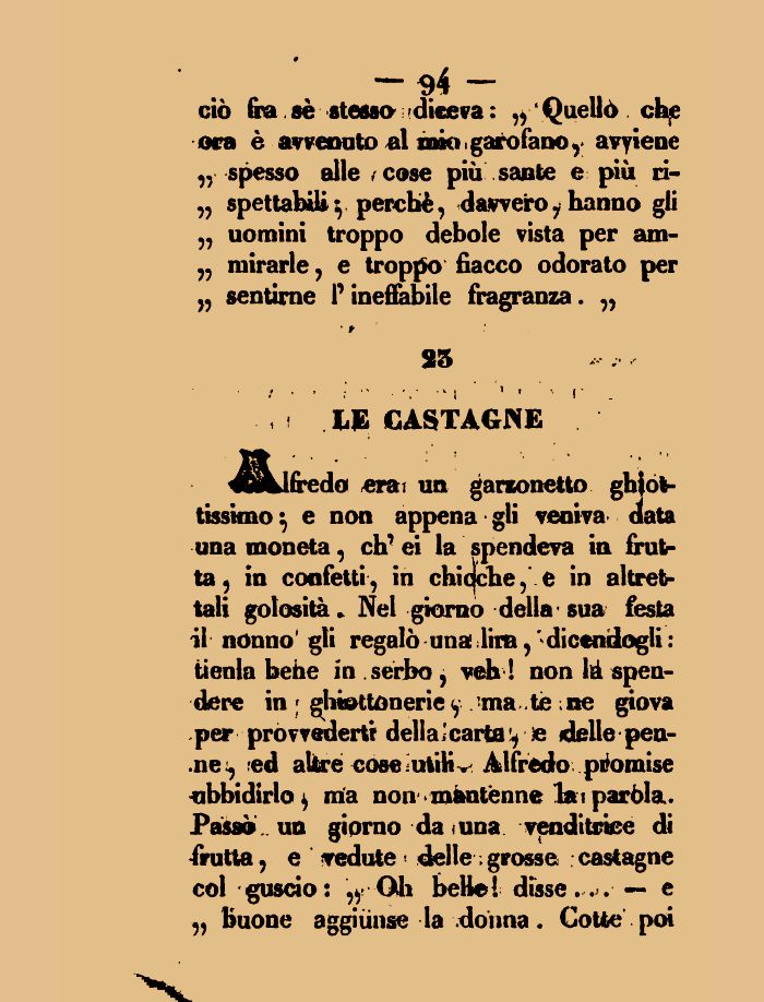 Ifredo erai un garzonetto ghióttissimo ; e non appena gli veniva data una moneta, eh7 ei la spendeva in frutta, in confetti, in chicjehe, e in altrettali golosità» Nel giorno della* sua festa il nonno' gli regalò unas.lira,'dicendogli: tienla behe in serbo, veh ! non là spendere in ; ghiottonerie y ma ,. te ; ne giova per provvederti della.'cartay e delle pen-.nei, .ed atbre co&e utiU . Alfredo promise •ubbidirlo^ ma non «mantenne lai paròla. Passò un giorno da t una venditrice di Trutta, e vedute « delle .grosse castagne col guscio: Oh bette 1 disse... — e ,, Buone aggiùnse la dolina. Cotte poi