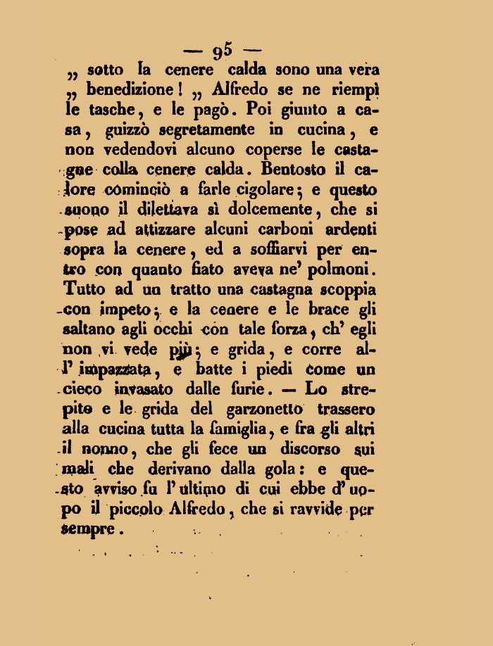 „ sotto la cenere calda sono una vera ,, benedizione ! „ Alfredo se ne riempì le tasche, e le pagò. Poi giunto a casa , guizzò segretamente in cucina, e non vedendovi alcuno coperse le castagne colla cenere calda. Bentosto il calore cominciò a farle cigolare } e questo suono il dilettava sì dolcemente, che si -pose ad attizzare alcuni carboni ardenti sopra la cenere, ed a soffiarvi per entro con quanto fiato aveva ne' polmoni. Tutto ad un tratto una castagna scoppia ~con impeto} e la cenere e le brace gli saltano agli occhi con tale forza, eh' egli non vi vede pje grida, e corre all' impazzate, e batte i piedi tome un .cieco invasato dalle furie. — Lo strepito e le grida del garzonetto trassero alla cucina tutta la famiglia, e fra gli altri il nonno, che gli fece un discorso $ui mali che derivano dalla gola : e questo avviso fu P ultimo di cui ebbe d'uopo il piccolo Alfredo, che si ravvide por sempre.