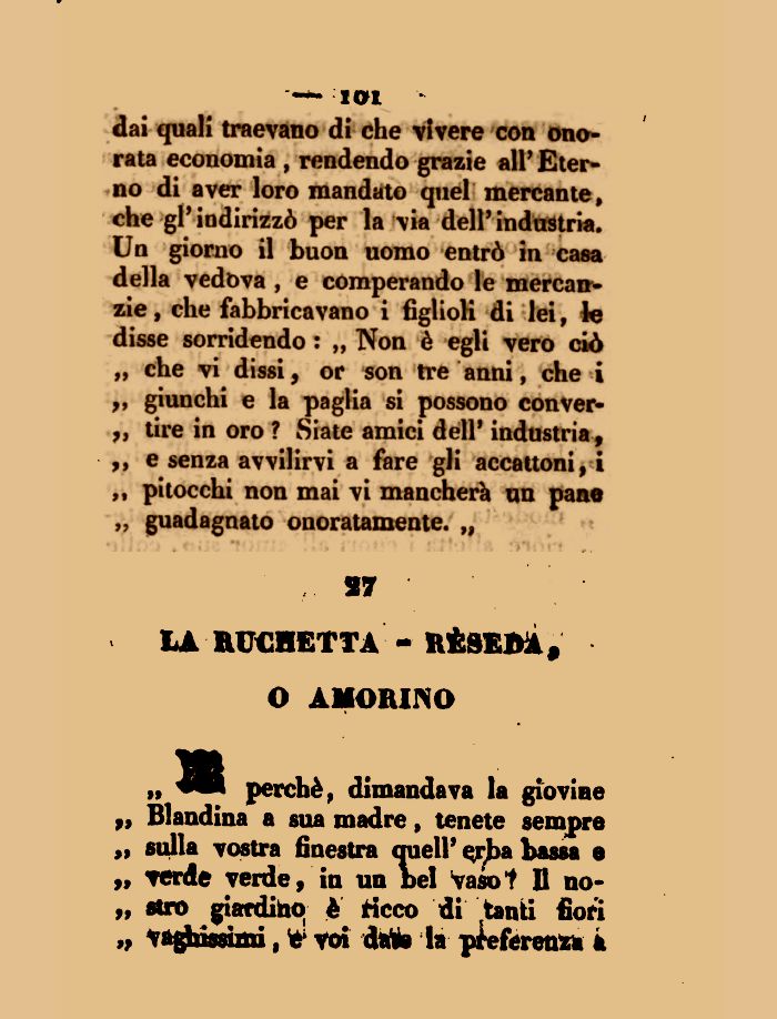 „ ® perchè, dimandava la giovine „ Blandina a sua madre , tenete sempre „ sulla vostra finestra ouell' qrj>a bassa e „ verde verde, in un bel Vaso? II no-„ stro giardino è ricco idi tanti fiori „ vaghissimi, W voi irtis la ptefóren» à