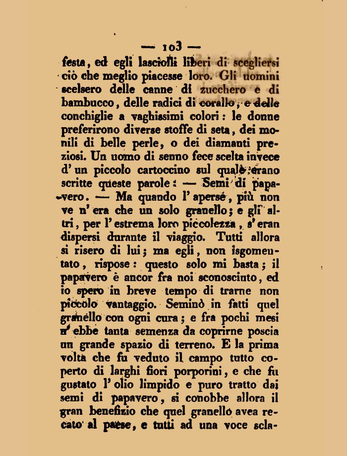— io3 — festa, ed egli lascioAi liberi di scégliersi ciò che meglio piacesse loro. Gli domini scelsero delle canne di zucchero e di bambucco, delle radici di corallo r e «UJJe conchiglie a vaghissimi colori : le donne preferirono diverse stoffe di seta, dei monili di belle perle, o dei diamanti preziosi. Un uomo di senno fece scelta invece d' un piccolo cartoccino sul quadè>*èrano scritte queste parole i — Semi idi papa-•¦vero. •— Ma quando 1' apersé, più non ve n' era che un solo granello ; e gif altri , per P estrema loro piccolezza , eran dispersi durante il viaggio. Tutti allora si risero di lui; ma egli, non isgomeu-tato, rispose : questo solo mi basta ; il papavero è ancor fra noi sconosciuto, ed io spero in breve tempo di trame non picteólo vantaggio. Seminò in fatti quel granèllo con ogni cura; e fra pochi mesi h ebbe tanta semenza da coprirne poscia un grande spazio di terreno. E la prima volta che fu veduto il campo tutto coperto di larghi fiori porporini, e che fu gustato Y olio limpido e puro tratto dai semi di papavero, si conobbe allora il gran benefizio che quel granellò avea recato' al palése, e tutti ad una voce scia-