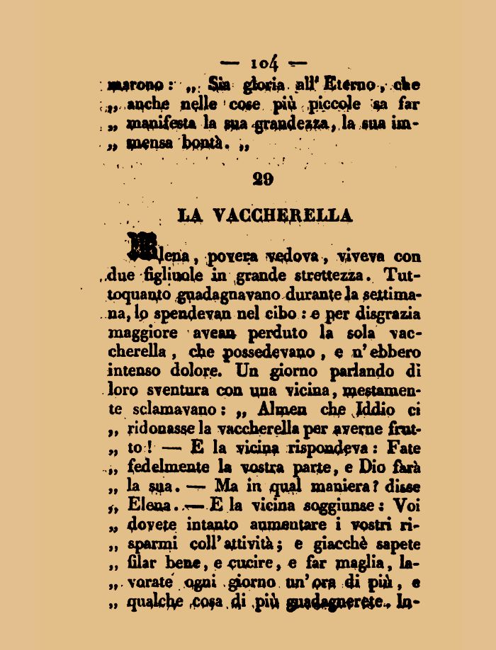 ^Rjena, potei» vedova, viveva con ( due figliuole in grande strettezza. Tut-toquaujo guadagnavano durante la settimana, lo spendeva nel cibo : e per disgrazia maggiore aveaa perduto la sola vaccherella , che possedevano , e n'ebbero intenso dolore. Un giorno parlando di loro sventura con una vicina, mestamente sclamavano : ,, Almen chje jddio ci ,, ridonasse la vaccherella per averne frut-„ to ! — E la vieiw rispondeva: Fate ,, fedelmente la vostra parte, e Dio fkrà „ la — Ma in maniera? disse u Eleaa. E la vicina soggiunse i Voi „ dovete intanto aumentare i vostri ri-„ spanni coli'attività; e giacché sapete „ filar bene, e -cucire, e far paglia, la-„ . varate <*gui giorno un'or* di più, e », qualche rCOfa di più Io*