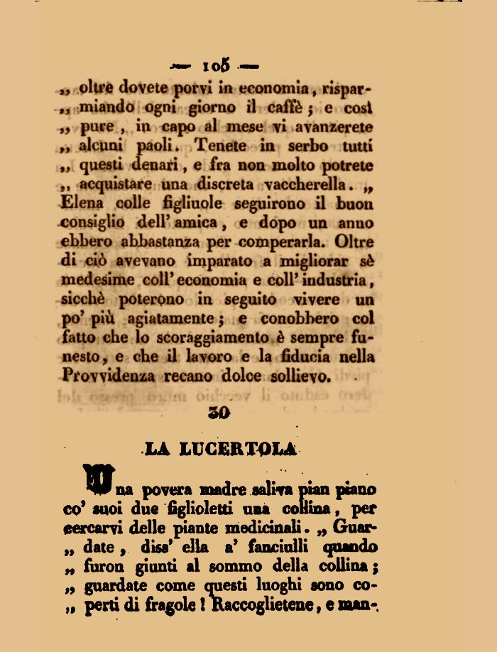 „ oltre dovete porvi in economia, rispar-„ miando ogni giorno il caffè ; e cosi „ pure , in capo al mese vi avanzerete „ alcuni paoli. Tenete in serbo tutti „ questi denari, e fra non molto potrete acquistare una discreta vaccherella. „ Elena colle figliuole seguirono il buon consiglio dell9 amica, e dopo un anno ebbero abbastanza per comperarla. Oltre di ciò avevano imparato a migliorar sè medesime coli' economia e coli' industria, sicché poterono in seguito vivere un po' più agiatamente $ e conobbero col fatto che lo scoraggiamento è sempre funesto, e che il lavoro e la fiducia nella Provvidenza recano dolce sollievo.