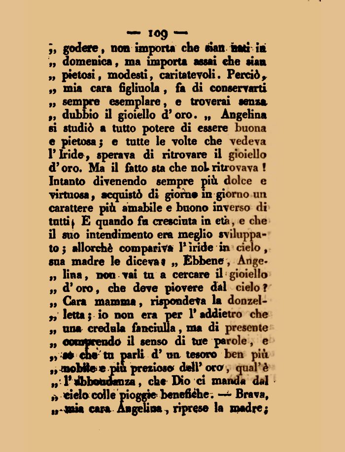 — log — godere, non importa che *utn Mtrin „ domenica 9 ma importa assai che sian „ pietosi, modesti, caritatevoli. Perciò, „ mia cara figliuola , fa di conserrarti „ sempre esemplare, e troverai senza „ dubbio il gioiello d'oro. „ Angelina si studiò a tutto potere di essere buona e pietosa; e tutte le volte che vedeva l'Iride, sperava di ritrovare il gioiello d'oro. Ma il fatto sta che noi ritrovava ! Intanto divenendo sempre più. dolce e virtuosa, acquistò di giorno in giorno un carattere più amabile e buono inverso di tattit E quando fa cresciuta in età, e che il suo intendimento era meglio sviluppato; allorché compariva l'iride in cielo, sua madre le diceva! „ Ebbene, Ange-„ lina, non vai tu a cercare il gioiello „ d'oro, che deve piovere dal cielo? „ Gara mamma, rispondeva la donzel-„ letta ; io non era per 1' addietro che „ una credula fanciulla, ma di presente „ commendo il senso di tue parole, e 9> Jè che to parli d' un tesoro ben più 9, cobite e più prezioso dell' oro, qu al' è „ l'&botumiza, che Dio ci manda dal „ eielo colle pioggie benefiche. ~ Brava, u lna cara Angelina, riprese la spadre;