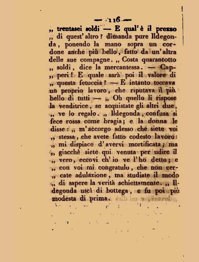 ,, di quest'altro? dimanda pure Ildegon-da, ponendo la mano sopra un cordone anche più bello, fatto da un'altra delle sue compagne. ,, Costa quarantotto ,, soldi, dice la mercantessa. — Cap-,, peri ! E quale sarà poi il valore di „ questa fetuccia ? — E intanto toccava un proprio lavoro, che riputava i\ più. bello di tutti — „ Oh quello li rispose la venditrice, se acquistategli altri due, „ ve lo regalo. „ lldegonda , confusa si fece rossa come bragia; e la donna le disse: ,, m'accorgo adesso che siete voi ,, stessa, che avete fatto codesto lavoro : „ mi dispiace d'avervi mortificata ; ma ,, giacché siete qui venuta per udire il „ vero, eccovi ch'io ve l'ho detto; e „ con voi mi congratulo , che non cer-„ cale adulazione, ma studiate il modo „ di sapere la verità schiettamente. ,, lldegonda usci di bottega , e fu poi più modesta di prima.