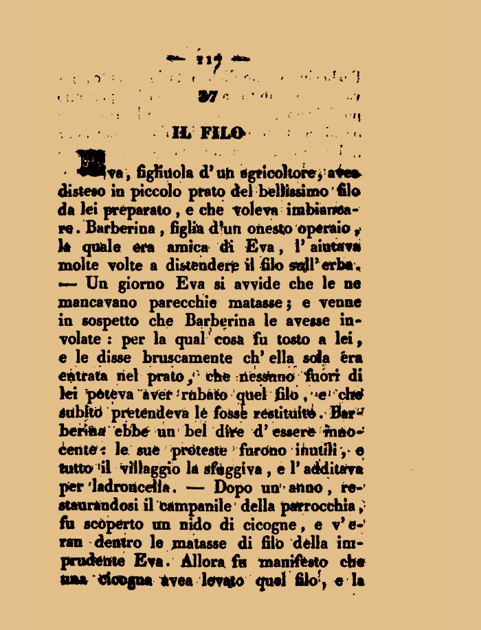 va , figliuola d'ut f^tieoltore,aie* disleso in piccolo prato del bellissimo'filo da lei preparalo , e che voleva imbiancare • Barberina , figlia dHm onesto operaio f> là quble era amica di Eva, V aiutava molte volte a distenderle il filo s^l' erba. Un giorno Eva si avvide che le ne mancavano parecchie matasse; e venne in sospetto che Barberina le avesse in* volate : per la qual cosa fu tosto a lei, e le disse bruscamente eh' ella scia èra entrata nel prato / che nessuno ibóii di lei pòtèva àvèr1 rubato quel filo , '^e1 ehé dtibltÒ pretèndeva lé fosse restituita. Bar^ berifcarebb* un bel dftfc d'essere tneo~ cente: le suè proteste furóno ihutili, e tutto1 il villaggio la sfuggiva , e l'additava perladroncetla. — Dopo un anno, restaurandosi il campanile della parrocchia >¦ fu scòperto un nido di cicogne, e v'e-ran dentro le matasse di filt> dèlia imprudente Eva. Allora fu manifesto che «ma tìoogna ivea levato quel fik>^ e la