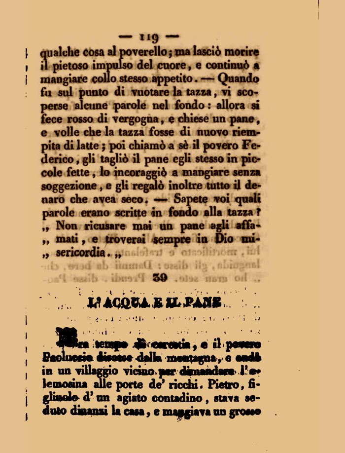 — tig — } qualche cosa al poverello ; ma lasciò morire i il pietoso impulso del cuore, e continuò a , mangiare collo stesso appetito. — Quando fu sul punto di vuotare la tazza, vi scoperse alcune parole nel fondo : allora si fece rosso di vergogna, e chiese un pane, e volle che la tazza fosse di nuovo riempita di latte ; poi chiamò a sè il povero Federico , gli tagliò il pane egli stesso in piccole fette, lo incoraggiò a mangiare senza soggezione , e gli regalò inoltre tutto il denaro che avea seco» — Sapete voi quali parole erano scritte in fondo alla tazza ? „ Non ricusare mai un pane agli affa» „ mati, e troverai sempre in Dio mi-„ sericordia. 9*