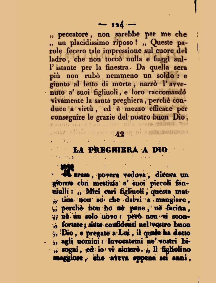 „ peccatore, non sarebbe per me che „ un placidissimo riposo ! M Queste parole fecero tale impressione sul cuore del ladro, che non toccò nulla e fuggi sul-V istante per la finestra. Da quella sera più non rubò nemmeno un soldo : e giunto al letto di morte , narrò P avvenuto a' suoi figliuoli, e loro raccomandò vivamente la santa preghiera, perchè conduce a virtù , ed è mezzo efficace per conseguire le grazie del nostro buon Dio,