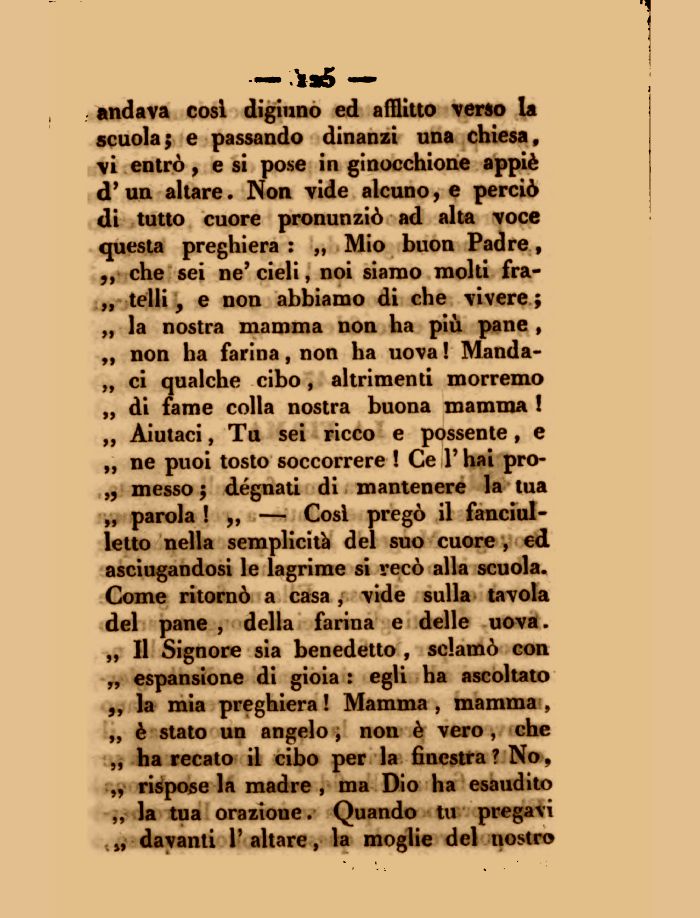 andava cosi digiuno ed afflitto verso la scuola; e passando dinanzi una chiesa, \i entrò, e si pose in ginocchione appiè d'un altare. Non vide alcuno, e perciò di tutto cuore pronunziò ad alta voce questa preghiera : „ Mio buon Padre, che sei ne'cieli, noi siamo molti fra-„ telli, e non abbiamo di che vivere ; „ la nostra mamma non ha più pane » ,, non ha farina, non ha uova ! Manda-„ ci qualche cibo, altrimenti morremo „ di fame colla nostra buona mamma ! „ Aiutaci, Tu sei ricco e possente, e „ ne puoi tosto soccorrere ! Ce l'hai pro-„ messo ; degnati di mantenere la tua „ parola ! „ — Cosi pregò il fanciul-letto nella semplicità del suo cuore , ed asciugandosi le lagrime si recò alla scuola. Come ritornò a casa , vide sulla tavola del pane , della farina e delle uova. „ Il Signore sia benedetto , sclamò con „ espansione di gioia : egli ha ascoltato ,, la mia preghiera ! Mamma , mamma , „ è stato un angelo , non è vero , che „ ha recato il cibo per la finestra ? No, „ rispose la madre , ma Dio ha esaudito ,, la tua orazioue. Quando tu pregavi „ davanti 1' altare, la moglie del nostro
