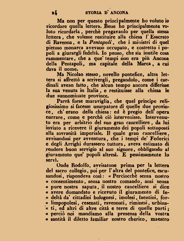Onde Rodolfo, avvisatone prima per la lettera del sacro collegio, poi per l'altra del pontefice, escusandosi , rispondeva così : « Perciocché senza nostro « consentimento, senza nostro comando, anzi senza « pure nostra saputa, il nostro cancelliere si dice « avere domandato e ricevuto il giuramento di fedeità da' cittadini bolognesi, imolesi, faentini, forlimpopolesi, cesenati, ravennati, riminesi, urbinati, ed altri di altre città e terre di quelle parti ; « perciò noi mandiamo alla presenza della vostra « santità il diletto familiar nostro cherico, maestro