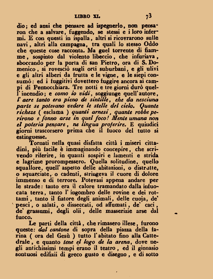 Le parti della città , che rimasero illese, furono queste: dal cantone di sopra della piazza della farina ( ora del Gesù ) tutto l'abitato fino alla Cattedrale , e quanto tene el logo de la arena, dove negli antichissimi tempi erano il teatro , ed il ginnasio sontuosi edifizii di greco gusto e diseguo , e di sotto