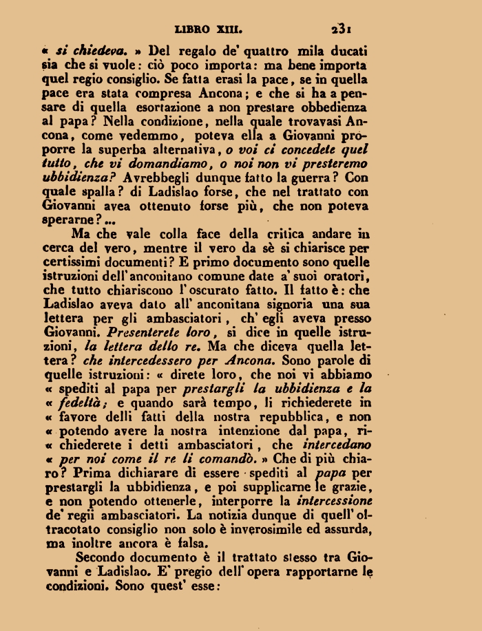« si chiedeva. » Del regalo de* quattro mila ducati 6Ìa che si vuole : ciò poco importa : ma bene importa quel regio consiglio. Se fatta erasi la pace, se in quella pace era stata compresa Ancona ; e che si ha a pensare di quella esortazione a non prestare obbedienza al papa ? Nella condizione, nella quale trovavasi Ancona, come vedemmo, poteva ella a Giovanni proporre la superba alternativa, o voi ci concedete quel tutto, che vi domandiamo, o noi non vi presteremo ubbidienza? Avrebbegli dunque fatto la guerra? Con quale spalla? di Ladislao forse, che nel trattato con Giovanni avea ottenuto forse più, che non poteva sperarne rMa che vale colla face della critica andare in cerca del vero, mentre il vero da sè si chiarisce per certissimi documenti? E primo documento sono quelle istruzioni dell'anconitano comune date a'suoi oratori, che tutto chiariscono l'oscurato fatto. Il fatto è : che Ladislao aveva dato all' anconitana signoria una sua lettera per gli ambasciatori , eh' egli aveva presso Giovanni. Presenterete loro, si dice in quelle istruzioni, la lettera dello re. Ma che diceva quella lettera ? che intercedessero per Ancona. Sono parole di quelle istruzioni: « direte loro, che noi vi abbiamo « spediti al papa per prestargli la ubbidienza e la « fedeltà; e quando sarà tempo, li richiederete in « favore dellì fatti della nostra repubblica, e non « potendo avere la nostra intenzione dal papa, richiederete i detti ambasciatori , che intercedano a per noi come il re li comandò. » Che di più chiaro? Prima dichiarare di essere spediti al papa per prestargli la ubbidienza, e poi supplicarne le grazie, e non potendo ottenerle, interporre la intercessione de' regii ambasciatori. La notizia dunque di quell' ol-tracotato consiglio non solo è inverosimile ed assurda, ma inoltre ancora è falsa.
