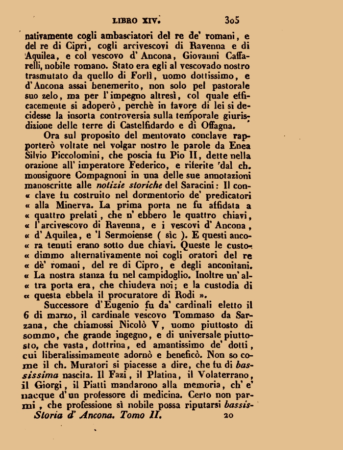 Cipri Ravenna Aquilea Ancona Giovanni Caffa-relli Forlì Ancona Castelfìdardo Offagna Enea Silvio Piccolomini Pio II Federico Compagnoni Saracini Minerva Ravenna Ancona Aquilea Sermoiense Cipro Rodi Eugenio Tommaso Sar-zana Nicolò V Fazi Platina Yolaterrano Giorgi Piatti Ancona Muratori