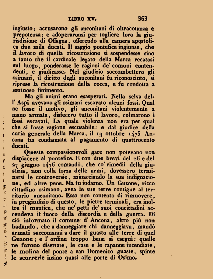 Ma gli animi erano esasperati. Nella selva dell' Aspi avevano gli osimani escavato alcuni fossi. Qual ne fosse il motivo, gli anconitani violentemente a mano armata, disfecero tutto il lavoro, colmarono i fossi escavati, La quale violenza non era per qual , che si fosse ragione escusabile: e dal giudice della . curia generale della Marca, il 19 ottobre 147^ Ancona fu condannata al pagamento di quattrocento ; ducati.