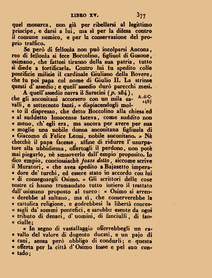 Se però di fellonìa non può incolparsi Ancona, reo di fellonìa si fece Boccolino, fìgliuol diGuzone, osimano, che fattosi tiranno della sua patria, tutto si diede a fortificarla. Contro lui fu spedito colle pontificie milizie il cardinale Giuliano della Rovere; che fu poi papa col nome di Giulio II. La strinse questi d' assedio ; e quell' assedio durò parecchi mesi.