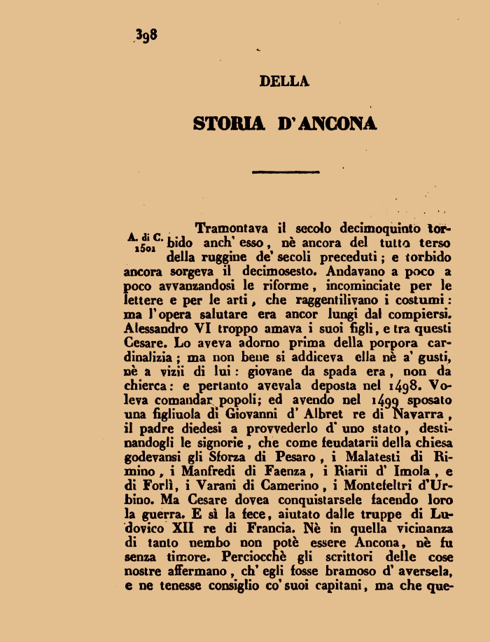 DELLA STORIA D'ANCONATramontava il secolo decimoquinto lor-ŧ5oiC bido anch' esso, nč ancora del tutto terso della ruggine de' secoli preceduti ; e torbido ancora sorgeva il decimosesto. Andavano a poco a poco avvanzandosi le riforme, incominciate per le lettere e per le arti, che raggentilivano i costumi : ma l'opera salutare era ancor lungi dal compiersi. Alessandro VI troppo amava i suoi figli, e tra questi Cesare. Lo aveva adorno prima della porpora cardinalizia ; ma non bene si addiceva ella nč a' gusti, nč a vizii di lui : giovane da spada era , non da chierca: e pertanto avevala deposta nel i4g8. Voleva comandar popoli; ed avendo nel 1499 sposato una figliuola di Giovanni d' Albret re di Navarra , il padre diedesi a provvederlo d" uno stato , destinandogli le signorie , che come feudatarii della chiesa godevansi gli Sforza di Pesaro , i Malatesti di Rimino , i Manfredi di Faenza , i Riarii d' Imola , e di Forlė, i Varani di Camerino, i Montefeltri d'Urbino. Ma Cesare dovea conquistarsele facendo loro la guerra. E sė la fece, aiutato dalle truppe di Ludovico XII re di Francia. Nč in quella vicinanza di tanto nembo non potč essere Ancona, nč fu senza timore. Perciocché gli scrittori delle cose nostre affermano, eh' egli fosse bramoso d' aversela, e ne tenesse consiglio co'suoi capitani, ma che que-