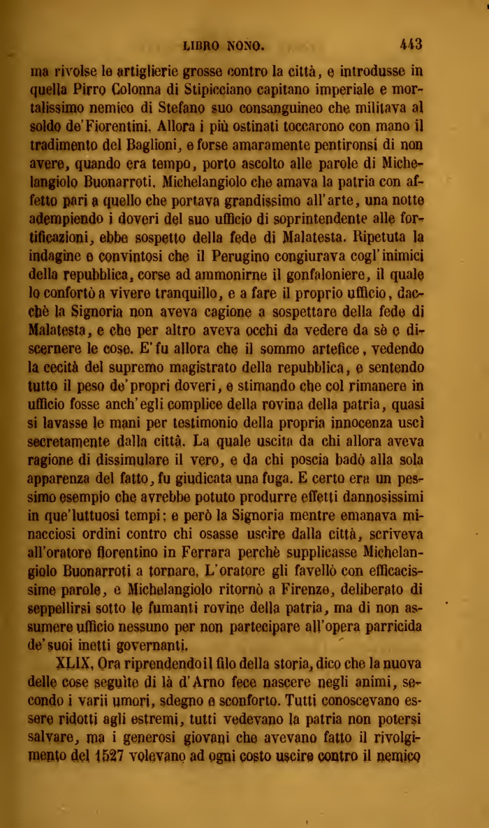 XLIX, Ora riprendendo il filo della storia, dico che la nuova delle cose seguite di là d'Arno fece nascere negli animi, secondo i varii umori, sdegno e sconforto. Tutti conoscevano essere ridotti agli estremi, tutti vedevano la patria non potersi salvare, ma i generosi giovani che avevano fatto il rivolgimento del 1527 volevano ad ogni costo uscire contro il nemico