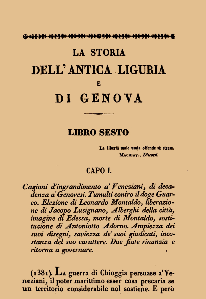 Cagioni d'ingrandimento a' Veneziani, di decadenza a' Genovesi. Tumulti contro il doge Guar-co. Elezione di Leonardo Montaldo, liberazione di Jacopo Lusignano, AIberghi della cittą, ima gin e di Edessa, morte di Montaldo, sostituzione di Antoniotto Adorno. Ampiezza dei suoi disegni, saviezza de' suoi giudicatiincostanza del suo carattere. Due fiate rinunzia e ritorna a governare.