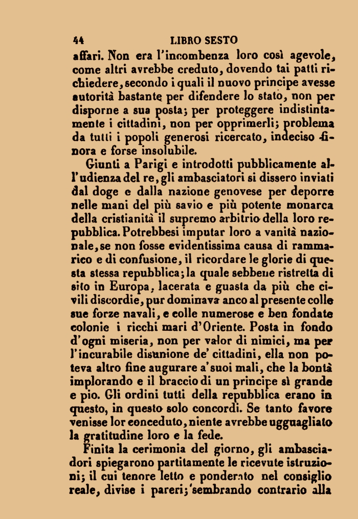 Giunti a Parigi e introdotti pubblicamente all'udienza del re,gli ambasciatori si dissero inviati dal doge e dalla nazione genovese per deporre nelle mani del più savio e più potente monarca della cristianità il supremo arbitrio della loro repubblica. Potrebbesi imputar loro a vanità nazionale, se non fosse evidentissima causa di rammarico e di confusione, il ricordare le glorie di questa stessa repubblica;la quale sebbene ristretta dì sito in Europa, lacerata e guasta da più che civili discordie, pur dominava anco al presente colle sue forze navali, e colle numerose e ben fondate colonie i ricchi mari d'Oriente. Posta in fondo d'ogni miseria, non per valor di nimici, ma per l'incurabile disunione de' cittadini, ella non poteva altro fine augurare a'suoi mali, che la bontà implorando e il braccio di un principe sì grande e pio. Gli ordini tutti della repubblica erano in questo, in questo solo concordi. Se tanto favore venisse lor conceduto, niente avrebbe ugguagliato la gratitudine loro e la fede.
