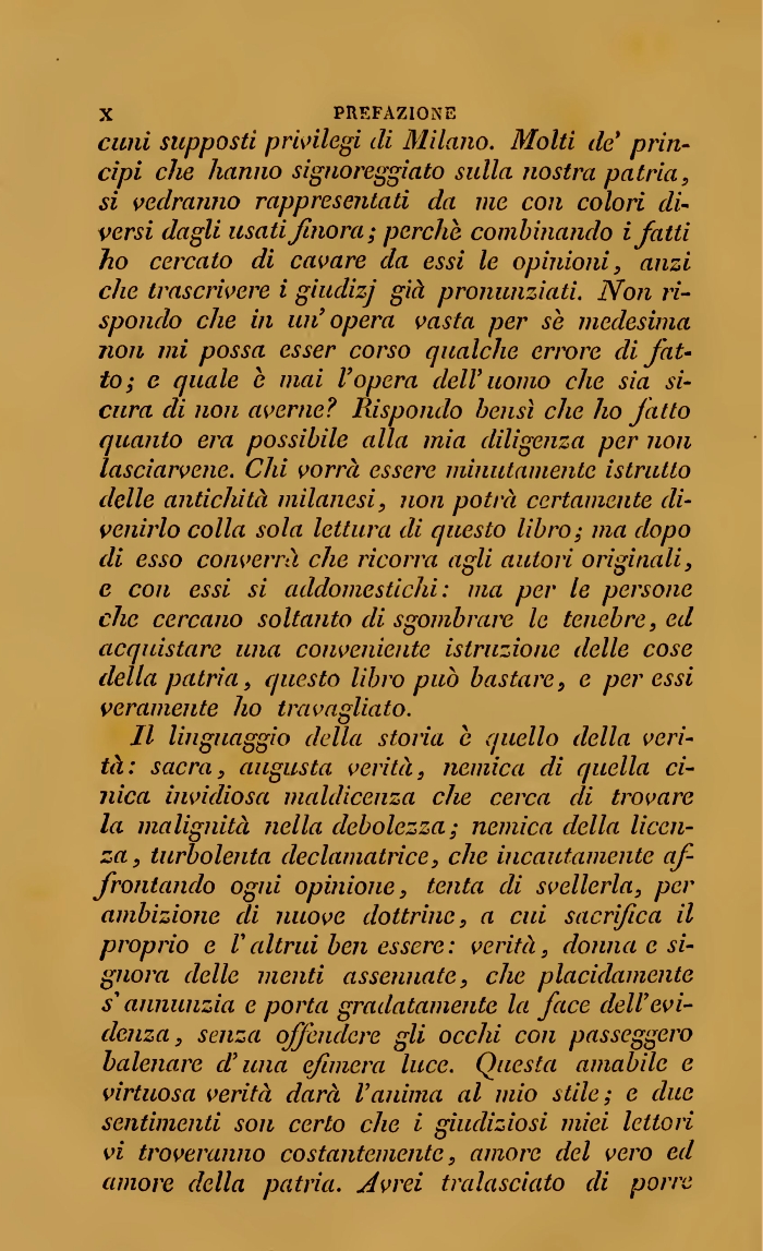 X PREFAZIONEcuni supposti privilegi di Milano. Molti de' princìpi che hanno signoreggiato sulla nostra patria, si vedranno rappresentati da me con colori diversi dagli usati finora; perche combinando i fatti ho cercato di cavare da essi le opinioni, anzi che trascrivere i giudizj già pronunziati. Non rispondo che in un'opera vasta per se medesima non mi possa esser corso qualche errore di fatto; e quale è mai l'opera dell'uomo che sia sicura di non averne? Rispondo bensì che ho fatto quanto era possibile alla mia diligenza per non lasciarvene. Chi vorrà essere minutamente istrutto delle antichità milanesi, non potrà certamente divenirlo colla sola lettura di questo libro; ma dopo di esso converrà che ricorra agli autori originali, e con essi si addomestichi: ma per le persone che cercano soltanto di sgombrare le tenebre, ed acquistare una conveniente istruzione delle cose della patria, questo libro può bastare, e per essi veramente ho travagliato.