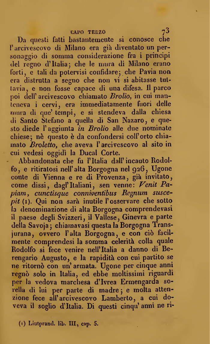 Abbandonata che fu l'Italia dall'incauto Rodol-fo, e ritiratosi nell'alta Borgogna nel 926, Ugone conte di Vienna e re di Provenza, già invitato, come dissi, dagl'Italiani, sen venne: Venit Pa-piani, cunctisque conniventibus Regnum susce-pit (1). Qui non sarà inutile l'osservare che sotto la denominazione di alta Borgogna comprendevasi il paese degli Svizzeri, il Vallese, Ginevra e parte della Savoja; chiamavasi questa la Borgogna Trans-jurana, ovvero l'alta Borgogna, e con ciò facilmente comprendesi la somma celerità colla quale Rodolfo si fece venire nell'Italia a danno di Berengario Augusto, e la rapidità con cui partito se ne ritornò con un' armata. Ugone per cinque anni regnò solo in Italia, ed ebbe moltissimi riguardi per la vedova marchesa d'Ivrea Ermengarda sorella di lui per parte di madre ; e molta attenzione fece all'arcivescovo Lamberto, a cui doveva il soglio d'Italia. Di questi cinqu'anni ne ri-