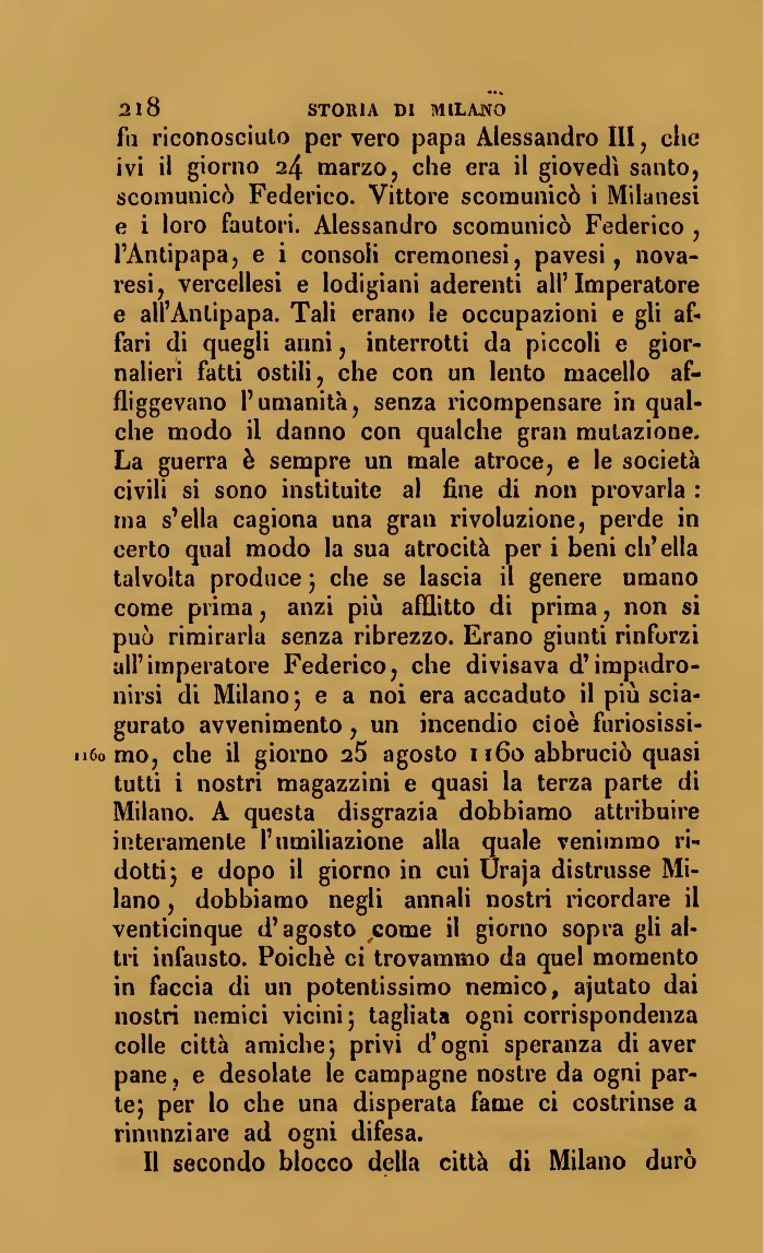 218 STORIA DI MILANOfu riconosciuto per vero papa Alessandro III, clic ivi il giorno 24 marzo, che era il giovedì santo, scomunicò Federico. Vittore scomunicò i Milanesi e i loro fautori. Alessandro scomunicò Federico , l'Antipapa, e i consoli cremonesi, pavesi, novaresi, vercellesi e lodigiani aderenti all'Imperatore e all'Antipapa. Tali erano le occupazioni e gli affari di quegli anni, interrotti da piccoli e giornalieri fatti ostili, che con un lento macello affliggevano l'umanità, senza ricompensare in qualche modo il danno con qualche gran mutazione. La guerra è sempre un male atroce, e le società civili si sono instituite al fine di non provarla : ma s'ella cagiona una gran rivoluzione, perde in certo qual modo la sua atrocità per i beni ch'ella talvolta produce ) che se lascia il genere umano come prima, anzi più afflitto di prima, non si può rimirarla senza ribrezzo. Erano giunti rinforzi all' imperatore Federico, che divisava d'impadronirsi di Milano ; e a noi era accaduto il più sciagurato avvenimento , un incendio cioè furiosissimo mo, che il giorno 25 agosto n6o abbruciò quasi tutti i nostri magazzini e quasi la terza parte di Milano. A questa disgrazia dobbiamo attribuire interamente l'umiliazione alla quale venimmo ridotti ) e dopo il giorno in cui Uraja distrusse Milano , dobbiamo negli annali nostri ricordare il venticinque d'agosto come il giorno sopra gli altri infausto. Poiché ci trovammo da quel momento in faccia di un potentissimo nemico, ajutato dai nostri nemici vicini 5 tagliata ogni corrispondenza colle città amichej privi d'ogni speranza di aver pane, e desolate le campagne nostre da ogni parte; per lo che una disperata fame ci costrinse a rinunziare ad ogni difesa.