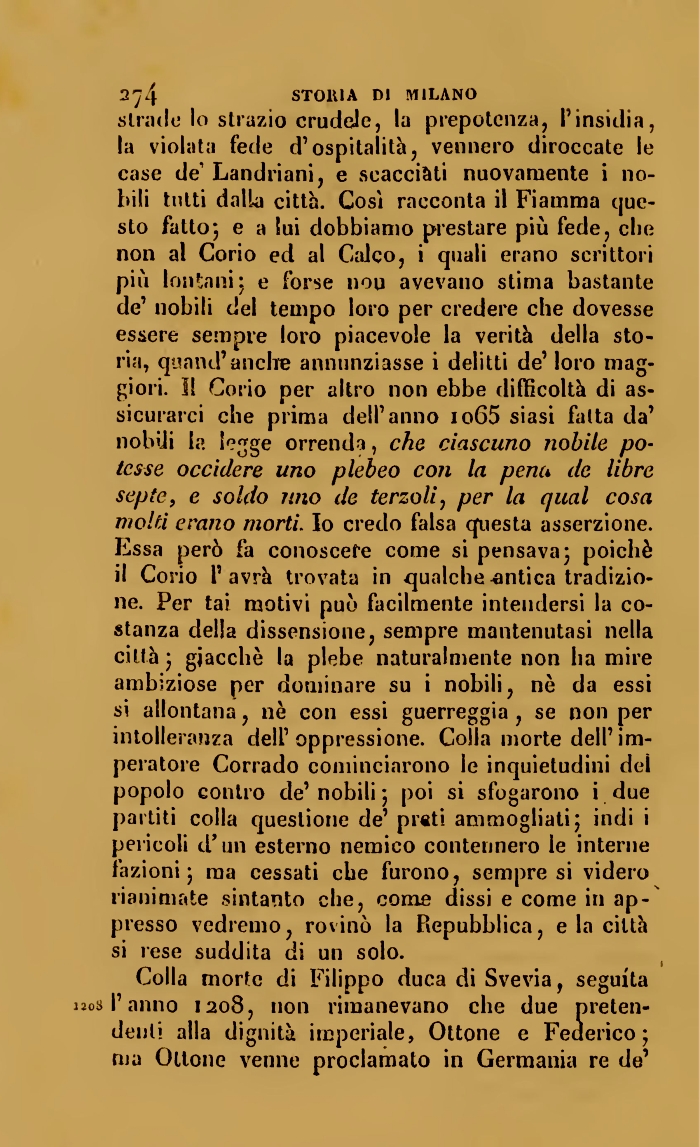 ST01UÀ DI MILANOstrade lo strazio crudele, la prepotenza, l'insidia, la violata fede d'ospitalità, vennero diroccate le case de' Landriani, e scacciati nuovamente i nobili tutti dalla città. Cosi racconta il Fiamma questo fatto5 e a lui dobbiamo prestare più fede, che non al Gorio ed al Calco, i quali erano scrittori più lontani: e forse nou avevano stima bastante de' nobili del tempo loro per credere che dovesse essere sempre loro piacevole la verità della storia, quand'anche annunziasse i delitti de' loro maggiori. Il Gorio per altro non ebbe difficoltà di assicurarci che prima dell'anno io65 siasi falta da' nobili la l?3ge orrenda, che ciascuno nobile potesse occidere uno plebeo con la pena de libre septe, e soldo imo de terzoli, per la guai cosa molti erano morti. Io credo falsa cfuesta asserzione. Essa però fa conoscete come si pensava 3 poiché il Corio l'avrà trovata in qualche antica tradizione. Per tai motivi può facilmente intendersi la costanza della dissensione, sempre mantenutasi nella città 5 giacche la plebe naturalmente non ha mire ambiziose per dominare su i nobili, nè da essi si allontana , nè con essi guerreggia , se non per intolleranza delT oppressione. Colla morte dell7 imperatore Corrado cominciarono le inquietudini dei popolo contro de'nobili ; poi si sfogarono i due partiti colla questione de' prati ammogliati; indi i pericoli d'un esterno nemico contennero le interne fazioni; ma cessati che furono, sempre si videro rianimate sintanto che, come dissi e come in ap-presso vedremo, rovinò la Repubblica, e la città si rese suddita di un solo.