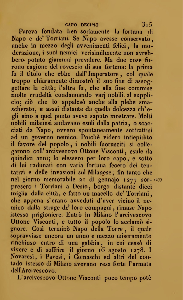 nel giorno memorabile 21 di gennajo 1277 sor- <*77 presero i Torriani a Desio, borgo distante dieci miglia dalla città, e fatto un macello de' Torriani, che appena s'erano avveduti d'aver vicino il nemico dalla strage de' loro compagni, rimase Napo istesso prigioniere. Entrò in Milano l'arcivescovo Ottone Visconti, e tutto il popolo lo acclamò signore. Così terminò Napo della Torre , il quale sopravvisse ancora un anno e mezzo miseramente rinchiuso entro di una gabbia, in cui cessò di vivere e di soffrire il giorno 16 agosto 1278. t Novaresi, i Pavesi, i Comaschi ed altri del contado istesso di Milano avevano resa forte l'armata dell'Arcivescovo.