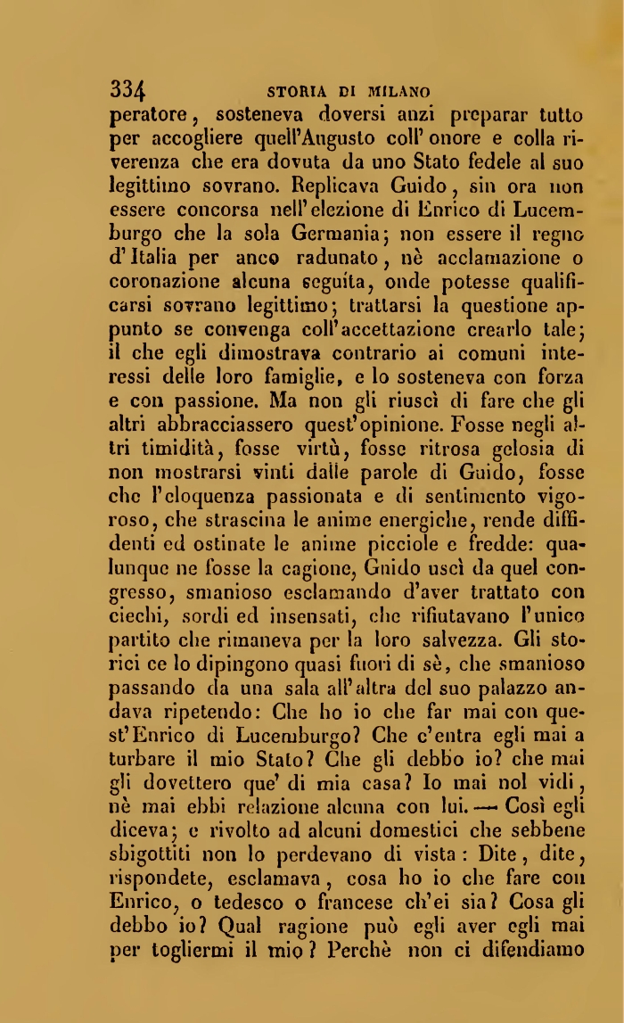 334 STORIA DI MILANOperatore , sosteneva doversi anzi preparar tutto per accogliere quell'Angusto coli' onore e colla riverenza che era dovuta da uno Stato fedele al suo legittimo sovrano. Replicava Guido, sin ora non essere concorsa nell'elezione di Enrico di Lucern-burgo che la sola Germania; non essere il regno d'Italia per anco radunato, nè acclamazione o coronazione alcuna seguita, onde potesse qualificarsi sovrano legittimo; trattarsi la questione appunto se convenga coli'accettazione crearlo tale; il che egli dimostrava contrario ai comuni interessi delle loro famiglie, e lo sosteneva con forza e con passione. Ma non gli riuscì di fare che gli altri abbracciassero quest'opinione. Fosse negli altri timidità, fosse virtù, fosse ritrosa gelosia di non mostrarsi vinti dalie parole di Guido, fosse che l'eloquenza passionata e di sentimento vigoroso, che strascina le anime energiche, rende diffidenti ed ostinate le anime picciole e fredde: qualunque ne fosse la cagione, Guido uscì da quel congresso, smanioso esclamando d'aver trattato con ciechi, sordi ed insensati, che rifiutavano l'unico partito che rimaneva per la loro salvezza. Gli storici ce lo dipingono quasi fuori di se, che smanioso passando da una sala all'altra del suo palazzo andava ripetendo: Che ho io che far mai con quest'Enrico di Lucemburgo? Che c'entra egli mai a turbare il mio Stato? Che gli debbo io? che mai gli dovettero que' di mia casa? Io mai noi vidi, nè mai ebbi relazione alcuna con lui. — Così egli diceva; e rivolto ad alcuni domestici che sebbene sbigottiti non lo perdevano di vista: Dite, dite, rispondete, esclamava, cosa ho io che fare con Enrico, o tedesco o francese ch'ei sia? Cosagli debbo io? Qual ragione può egli aver egli mai per togliermi il mio ? Perchè non ci difendiamo