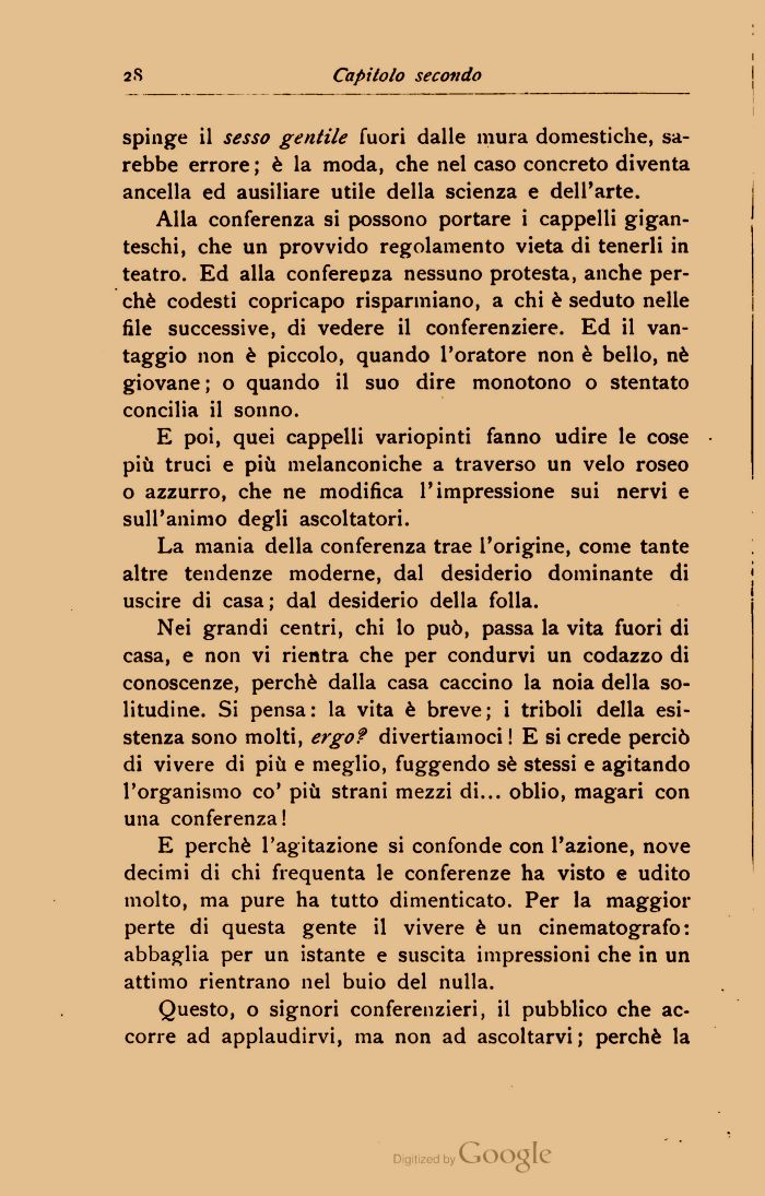 Alla conferenza si possono portare i cappelli giganteschi, che un provvido regolamento vieta di tenerli in teatro. Ed alla confereuza nessuno protesta, anche perchè codesti copricapo risparmiano, a chi è seduto nelle file successive, di vedere il conferenziere. Ed il vantaggio non è piccolo, quando l'oratore non è bello, nè giovane ; o quando il suo dire monotono o stentato concilia il sonno.
