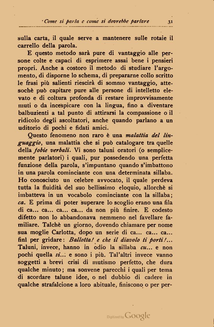 Questo fenomeno non raro è una malattia del linguaggio, una malattia che si può catalogare tra quelle della fobie verbali. Vi sono taluni oratori (o semplicemente parlatori) i quali, pur possedendo una perfetta funzione della parola, s'impuntano quando s'imbattono in una parola cominciarne con una determinata sillaba. Ho conosciuto un celebre avvocato, il quale perdeva tutta la fluidità del suo bellissimo eloquio, allorché si imbatteva in un vocabolo cominciante con la sillaba; ca. E prima di poter superare lo scoglio erano una fila di ca... ca... ca... ca... da non più finire. E codesto difetto non lo abbandonava nemmeno nel favellare familiare. Talché un giorno, dovendo chiamare per nome sua moglie Carlotta, dopo un serie di ca... ca... ca... fini per gridare: Ballotta! e che il diavolo ti porti.'... Taluni, invece, hanno in odio la sillaba cu... e non pochi quella si... e sono i più. Tal'altri invece vanno soggetti a brevi crisi di mutismo perfetto, che dura qualche minuto; ma sonvene parecchi i quali per tema di scordare talune idee, o nel dubbio di cadere in qualche strafalcione a loro abituale, finiscono o per per-