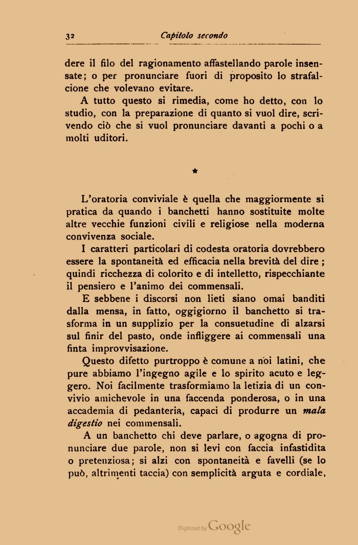 Questo difetto purtroppo è comune a noi latini, che pure abbiamo l'ingegno agile e lo spirito acuto e leggero. Noi facilmente trasformiamo la letizia di un convivio amichevole in una faccenda ponderosa, o in una accademia di pedanteria, capaci di produrre un mala digestio nei commensali.