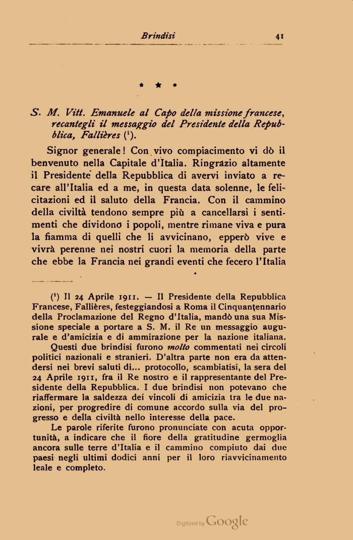 (') Il 24 Aprile 1911. — Il Presidente della Repubblica Francese, Fallières, festeggiandosi a Roma il Cinquantennario della Proclamazione del Regno d'Italia, mandò una sua Missione speciale a portare a S. M. il Re un messaggio augurale e d'amicizia e di ammirazione per la nazione italiana.