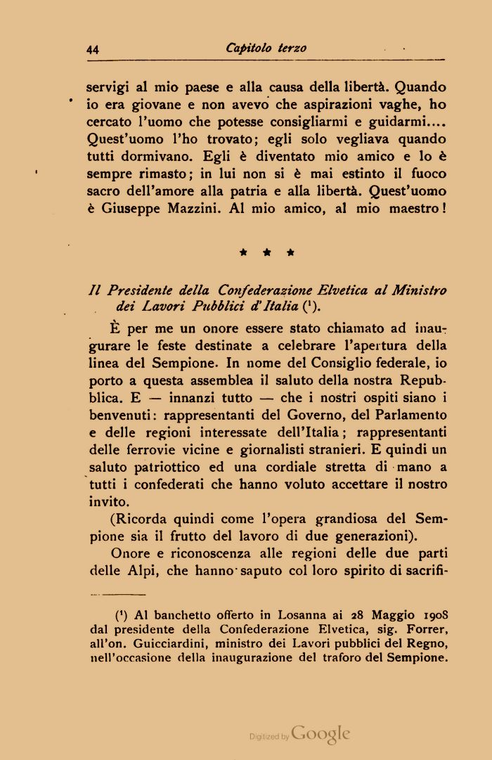 (') Al banchetto offerto in Losanna ai 28 Maggio 190S dal presidente della Confederazione Elvetica, sig. Forrer, all'on. Guicciardini, ministro dei Lavori pubblici del Regno, nell'occasione della inaugurazione del traforo del Sempione.