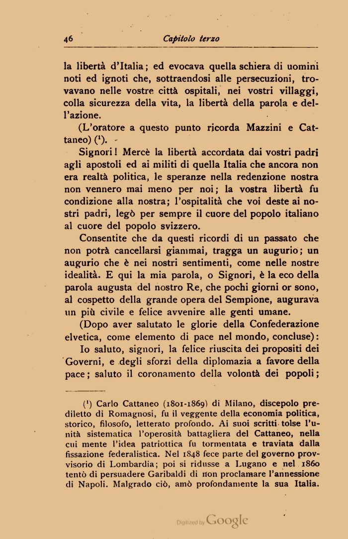 Signori ! Mercè la libertà accordata dai vostri padri agli apostoli ed ai militi di quella Italia che ancora non era realtà politica, le speranze nella redenzione nostra non vennero mai meno per noi ; la vostra libertà fu condizione alla nostra; l'ospitalità che voi deste ai nostri padri, legò per sempre il cuore del popolo italiano al cuore del popolo svizzero.