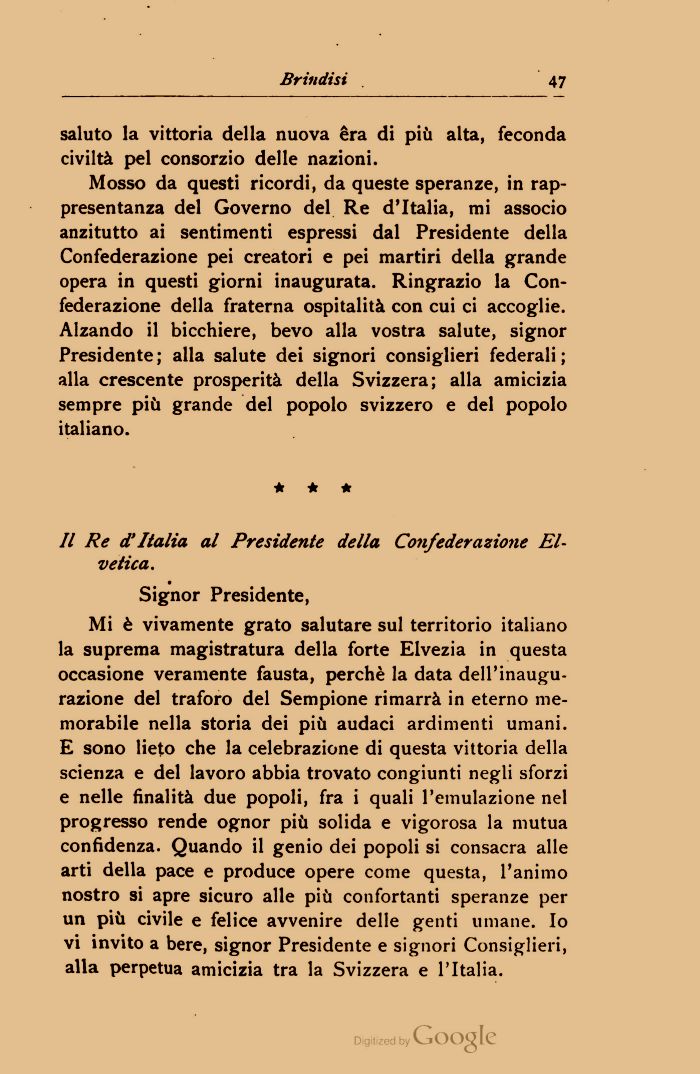 Mi è vivamente grato salutare sul territorio italiano la suprema magistratura della forte Elvezia in questa occasione veramente fausta, perchè la data dell'inaugurazione del traforo del Sempione rimarrà in eterno memorabile nella storia dei più audaci ardimenti umani. E sono lieto che la celebrazione di questa vittoria della scienza e del lavoro abbia trovato congiunti negli sforzi e nelle finalità due popoli, fra i quali l'emulazione nel progresso rende ognor più solida e vigorosa la mutua confidenza. Quando il genio dei popoli si consacra alle arti della pace e produce opere come questa, l'animo nostro si apre sicuro alle più confortanti speranze per un più civile e felice avvenire delle genti umane. Io vi invito a bere, signor Presidente e signori Consiglieri, alla perpetua amicizia tra la Svizzera e l'Italia.