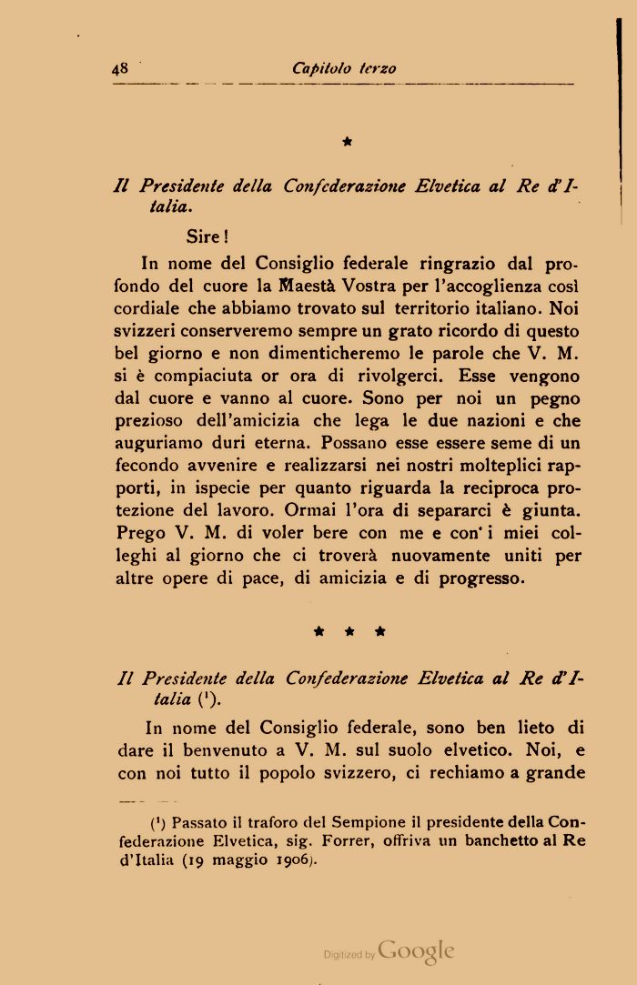 In nome del Consiglio federale ringrazio dal profondo del cuore la Maestà Vostra per l'accoglienza cosi cordiale che abbiamo trovato sul territorio italiano. Noi svizzeri conserveremo sempre un grato ricordo di questo bel giorno e non dimenticheremo le parole che V. M. si è compiaciuta or ora di rivolgerci. Esse vengono dal cuore e vanno al cuore. Sono per noi un pegno prezioso dell'amicizia che lega le due nazioni e che auguriamo duri eterna. Possano esse essere seme di un fecondo avvenire e realizzarsi nei nostri molteplici rapporti, in ispecie per quanto riguarda la reciproca protezione del lavoro. Ormai l'ora di separarci è giunta. Prego V. M. di voler bere con me e con' i miei colleghi al giorno che ci troverà nuovamente uniti per altre opere di pace, di amicizia e di progresso.