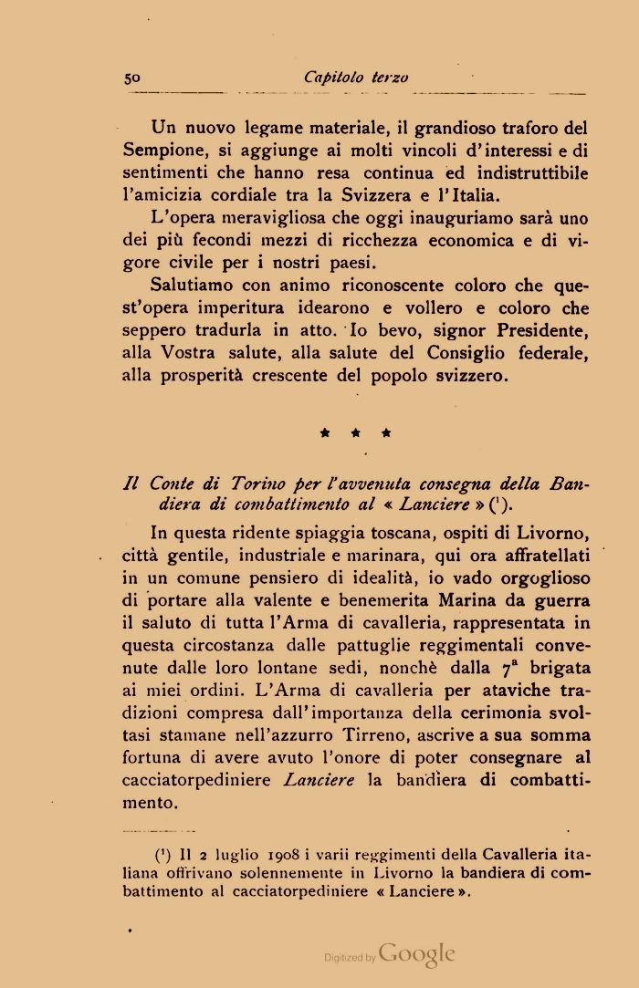 Un nuovo legame materiale, il grandioso traforo del Sempione, si aggiunge ai molti vincoli d'interessi e di sentimenti che hanno resa continua ed indistruttibile l'amicizia cordiale tra la Svizzera e l'Italia.