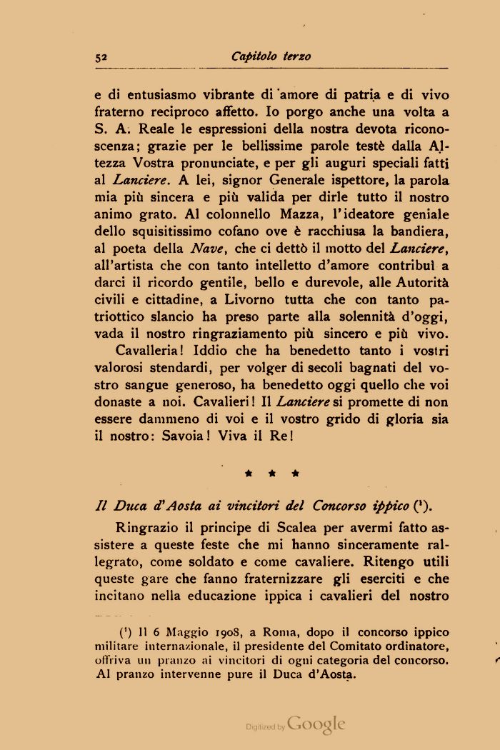 Ringrazio il principe di Scalea per avermi fatto assistere a queste feste che mi hanno sinceramente rallegrato, come soldato e come cavaliere. Ritengo utili queste gare che fanno fraternizzare gli eserciti e che incitano nella educazione ippica i cavalieri del nostro