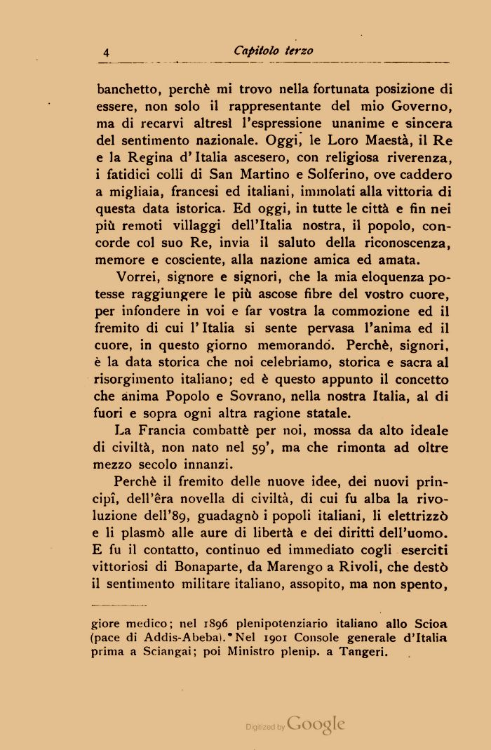 banchetto, perchè mi trovo nella fortunata posizione di essere, non solo il rappresentante del mio Governo, ma di recarvi altresì l'espressione unanime e sincera del sentimento nazionale. Oggi, le Loro Maestà, il Re e la Regina d'Italia ascesero, con religiosa riverenza, i fatidici colli di San Martino e Solferino, ove caddero a migliaia, francesi ed italiani, immolati alla vittoria di questa data istorica. Ed oggi, in tutte le città e fin nei più remoti villaggi dell'Italia nostra, il popolo, concorde col suo Re, invia il saluto della riconoscenza, memore e cosciente, alla nazione amica ed amata.