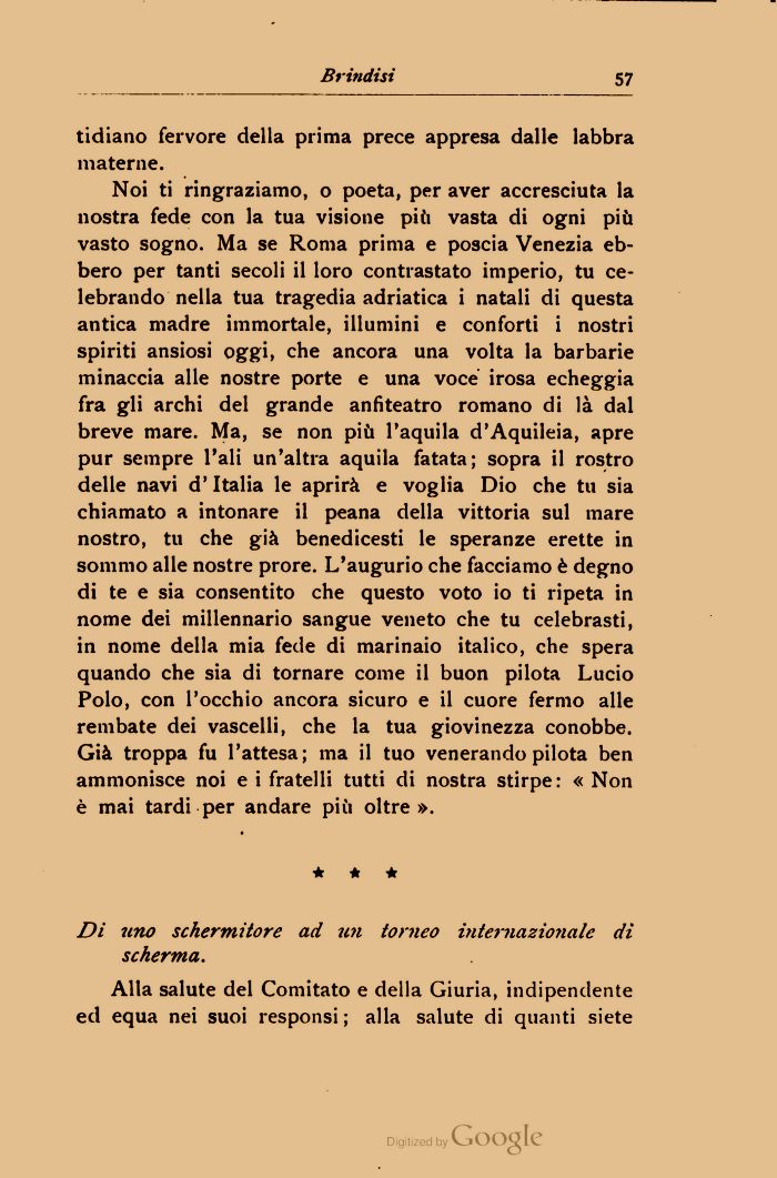 Noi ti ringraziamo, o poeta, per aver accresciuta la nostra fede con la tua visione pił vasta di ogni pił vasto sogno. Ma se Roma prima e poscia Venezia ebbero per tanti secoli il loro contrastato imperio, tu celebrando nella tua tragedia adriatica i natali di questa antica madre immortale, illumini e conforti i nostri spiriti ansiosi oggi, che ancora una volta la barbarie minaccia alle nostre porte e una voce irosa echeggia fra gli archi del grande anfiteatro romano di lą dal breve mare. Ma, se non pił l'aquila d'Aquileia, apre pur sempre l'ali un'altra aquila fatata; sopra il rostro delle navi d'Italia le aprirą e voglia Dio che tu sia chiamato a intonare il peana della vittoria sul mare nostro, tu che gią benedicesti le speranze erette in sommo alle nostre prore. L'augurio che facciamo č degno di te e sia consentito che questo voto io ti ripeta in nome dei millennario sangue veneto che tu celebrasti, in nome della mia fede di marinaio italico, che spera quando che sia di tornare come il buon pilota Lucio Polo, con l'occhio ancora sicuro e il cuore fermo alle rembate dei vascelli, che la tua giovinezza conobbe. Gią troppa fu l'attesa; ma il tuo venerando pilota ben ammonisce noi e i fratelli tutti di nostra stirpe: « Non č mai tardi per andare pił oltre».