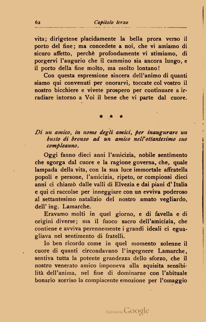 Oggi fanno dieci anni l'amicizia, nobile sentimento che sgorga dal cuore e la ragione governa, che, quale lampada della vita, con la sua luce immortale affratella popoli e persone, l'amicizia, ripeto, or compionsi dieci anni ci chiamò dalle valli di Elvezia e dai piani d'Italia e qui ci raccolse per inneggiare con un evviva poderoso al settantesimo natalizio del nostro amato vegliardo, dell' ing. Lamarche.