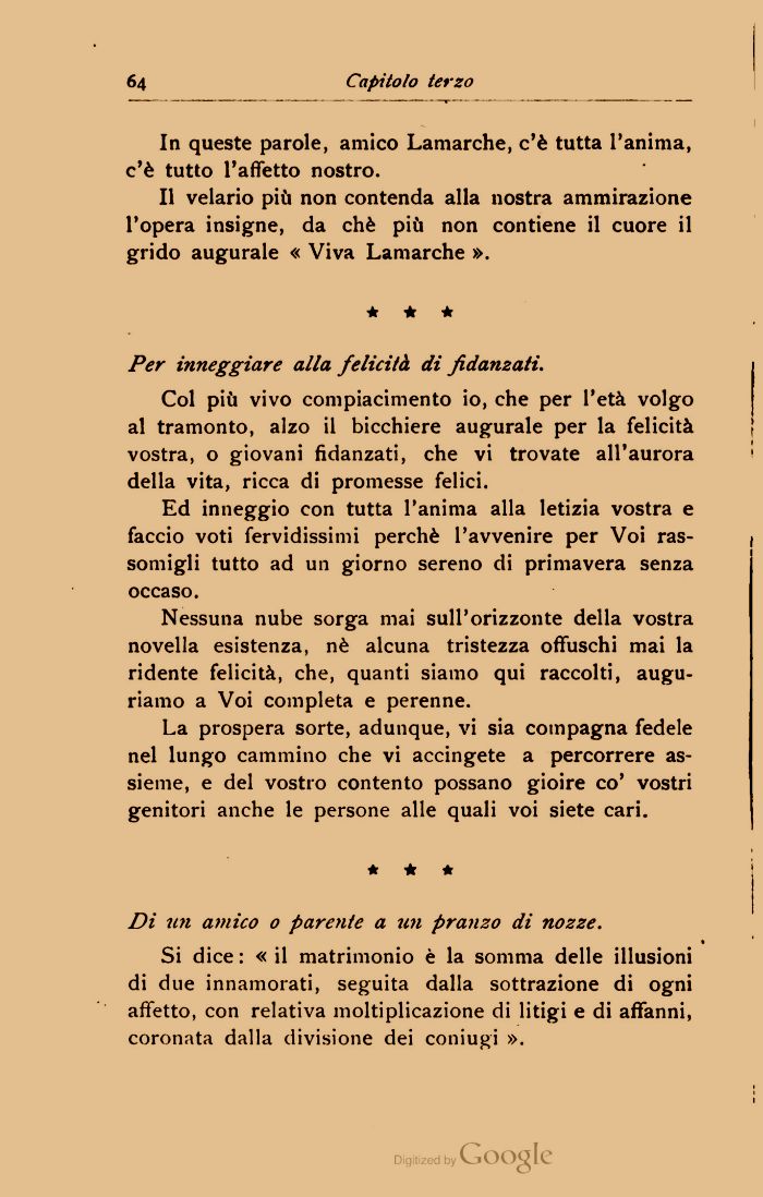 Col più vivo compiacimento io, che per l'età volgo al tramonto, alzo il bicchiere augurale per la felicità vostra, o giovani fidanzati, che vi trovate all'aurora della vita, ricca di promesse felici.
