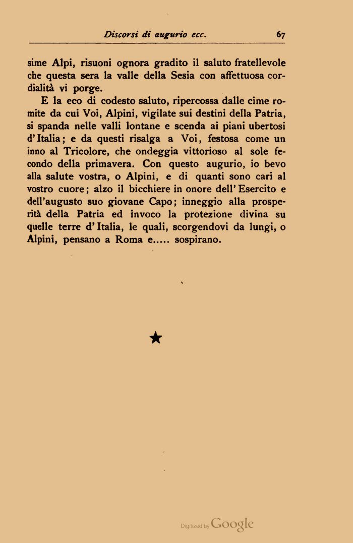 E la eco di codesto saluto, ripercossa dalle cime romite da cui Voi, Alpini, vigilate sui destini della Patria, si spanda nelle valli lontane e scenda ai piani ubertosi d'Italia; e da questi risalga a Voi, festosa come un inno al Tricolore, che ondeggia vittorioso al sole fecondo della primavera. Con questo augurio, io bevo alla salute vostra, o Alpini, e di quanti sono cari al vostro cuore; alzo il bicchiere in onore dell'Esercito e dell'augusto suo giovane Capo; inneggio alla prosperità della Patria ed invoco la protezione divina su quelle terre d'Italia, le quali, scorgendovi da lungi, o Alpini, pensano a Roma e..... sospirano.
