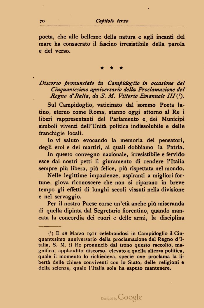 Discorso pronunciato in Campidoglio in occasione del Cinquantesimo anniversario della Proclamazione del Regno d'Italia, da S. M. Vittorio Emanuele ///(')•