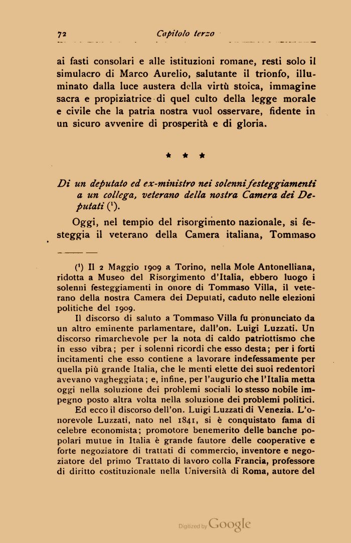 (') Il 2 Maggio 1909 a Torino, nella Mole Antonelliana, ridotta a Museo del Risorgimento d'Italia, ebbero luogo i solenni festeggiamenti in onore di Tommaso Villa, il veterano della nostra Camera dei Deputati, caduto nelle elezioni politiche del 1909.