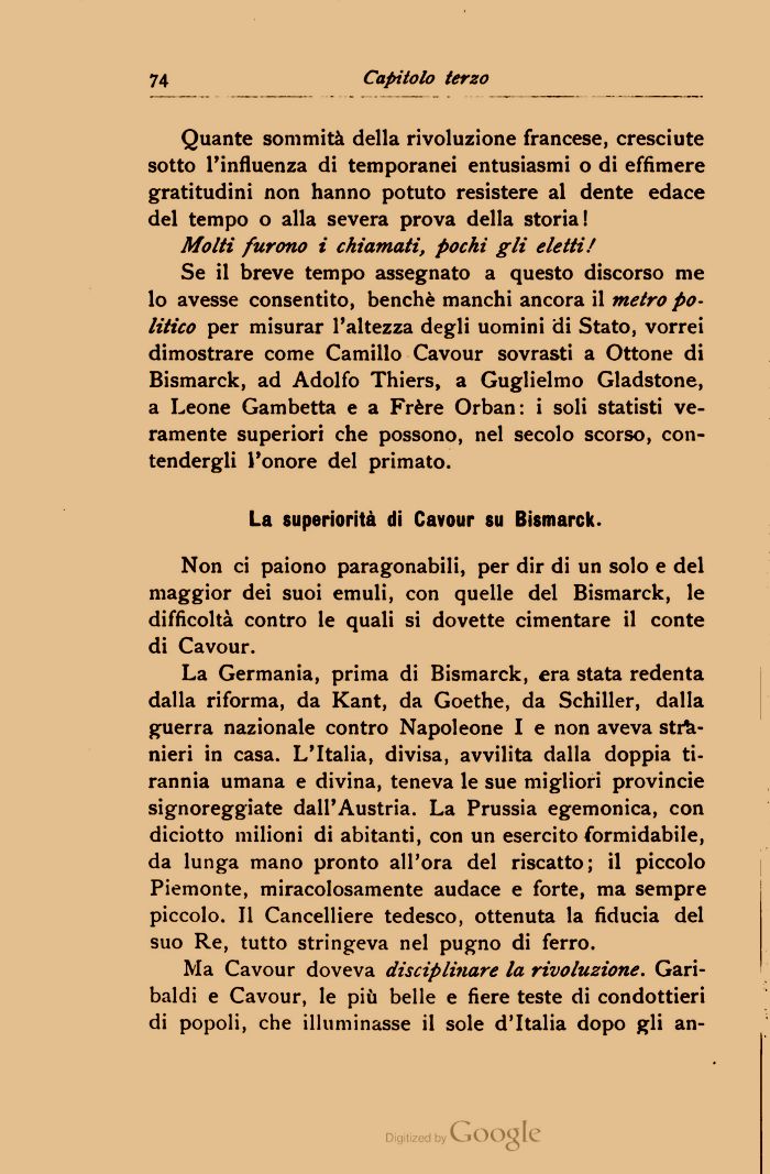 Se il breve tempo assegnato a questo discorso me lo avesse consentito, benché manchi ancora il metro politico per misurar l'altezza degli uomini di Stato, vorrei dimostrare come Camillo Cavour sovrasti a Ottone di Bismarck, ad Adolfo Thiers, a Guglielmo Gladstone, a Leone Gambetta e a Frère Orban : i soli statisti veramente superiori che possono, nel secolo scorso, contendergli l'onore del primato.