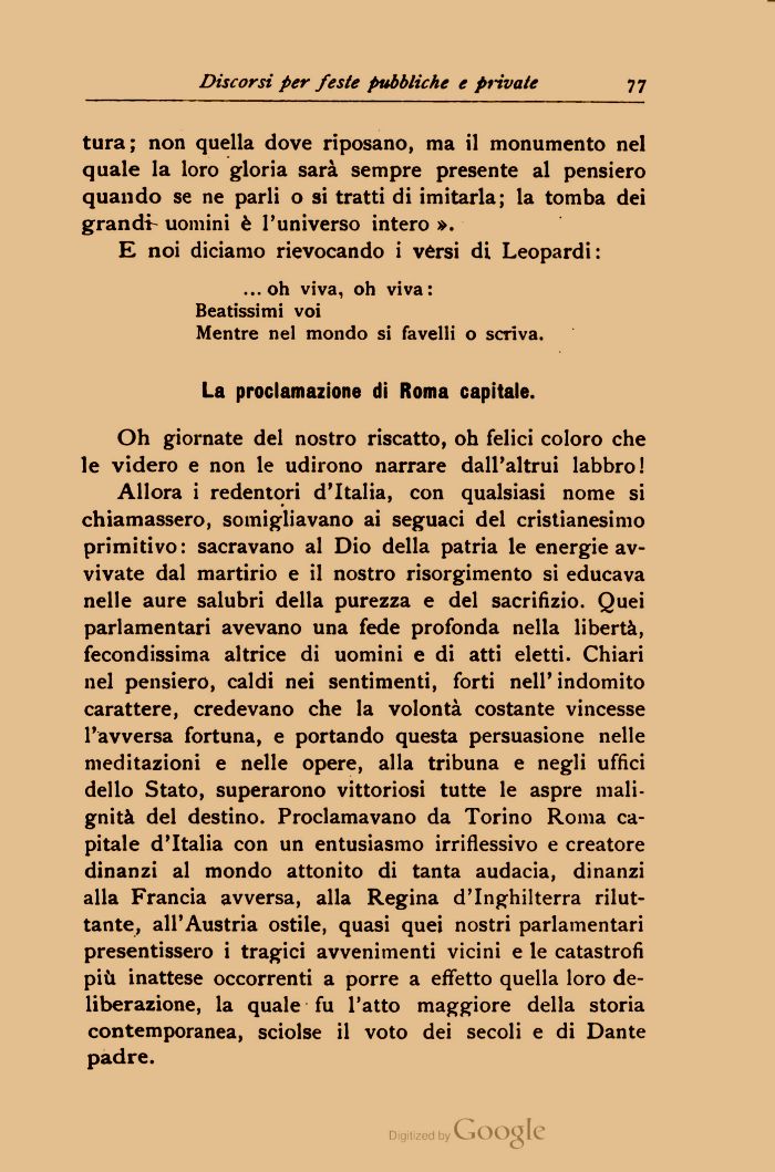 Allora i redentori d'Italia, con qualsiasi nome si chiamassero, somigliavano ai seguaci del cristianesimo primitivo: sacravano al Dio della patria le energie avvivate dal martirio e il nostro risorgimento si educava nelle aure salubri della purezza e del sacrifizio. Quei parlamentari avevano una fede profonda nella libertà, fecondissima altrice di uomini e di atti eletti. Chiari nel pensiero, caldi nei sentimenti, forti nell' indomito carattere, credevano che la volontà costante vincesse l'avversa fortuna, e portando questa persuasione nelle meditazioni e nelle opere, alla tribuna e negli uffici dello Stato, superarono vittoriosi tutte le aspre malignità del destino. Proclamavano da Torino Roma capitale d'Italia con un entusiasmo irriflessivo e creatore dinanzi al mondo attonito di tanta audacia, dinanzi alla Francia avversa, alla Regina d'Inghilterra riluttante, all'Austria ostile, quasi quei nostri parlamentari presentissero i tragici avvenimenti vicini e le catastrofi più inattese occorrenti a porre a effetto quella loro deliberazione, la quale fu l'atto maggiore della storia contemporanea, sciolse il voto dei secoli e di Dante padre.